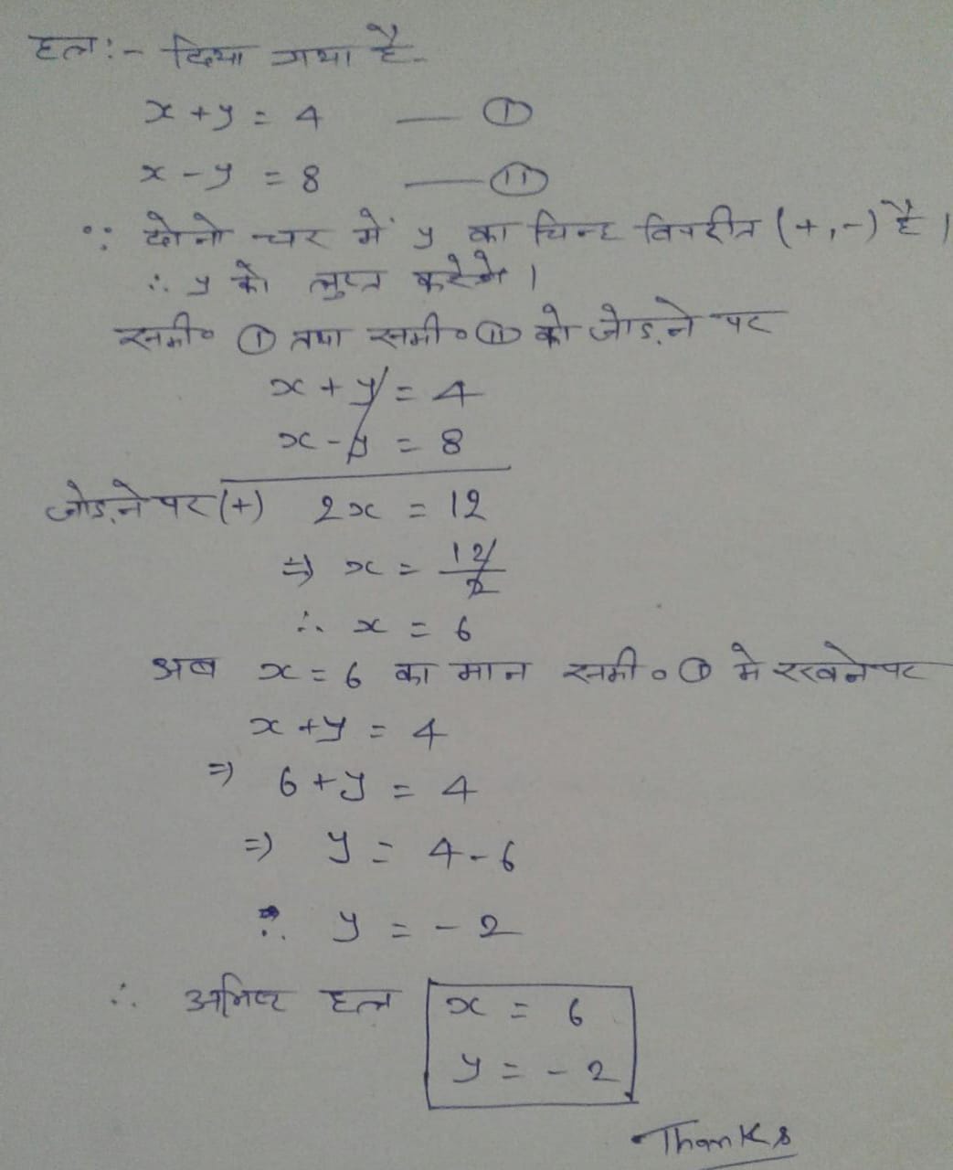 - ठीक वैसे ही इस कहानी की तरह पहले दोनो चर राशि में किसी एक चर को समान कर लेना है।यदि दोनो विपरीत चिन्ह(+-) के है तो योग कर उन्हे लुप्त कर देते है और यदि एक समान चिन्ह(++ या--) हो तो घटाव कर लुप्त कर देते है।फिर बचे हुए एक चर वाले दोनो को हल कर एक चर का मान प्राप्त कर लेते है।फिर प्राप्त चर के मान को किसी भी समीकरण में रख कर दूसरे चर का मान प्राप्त कर लेते है।